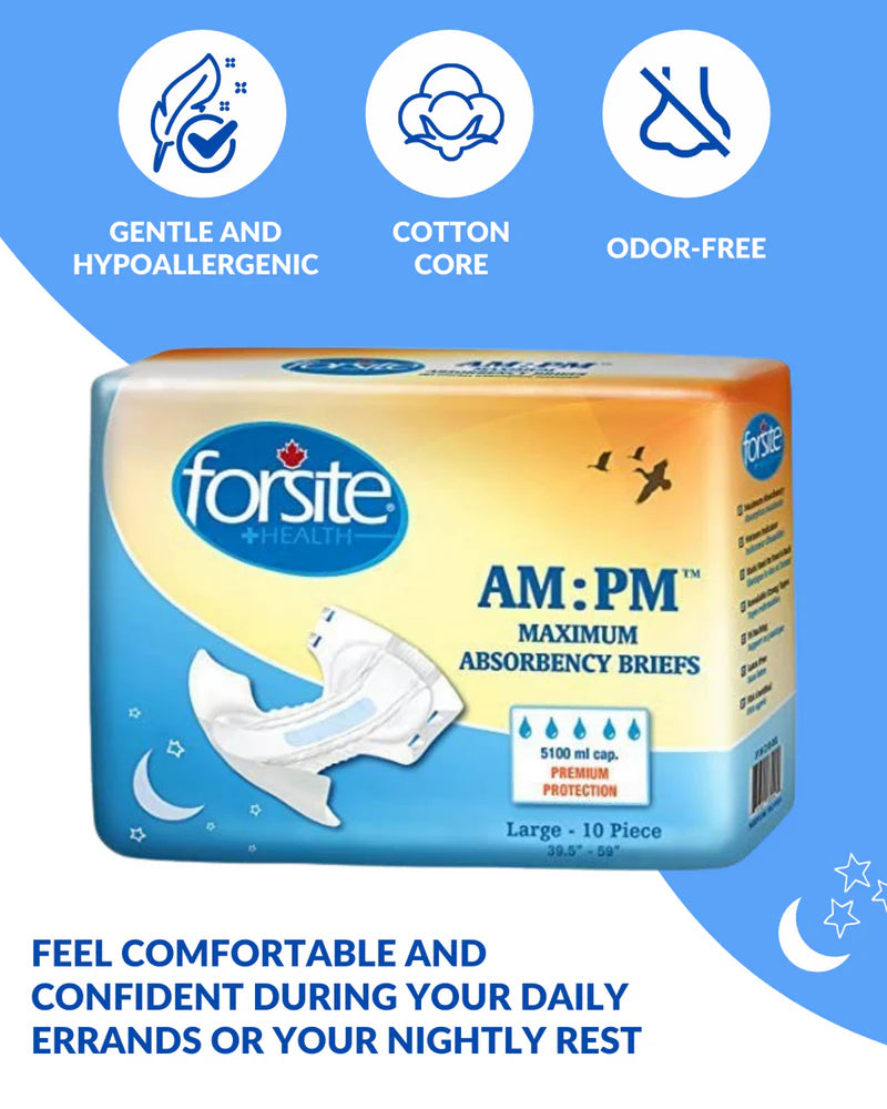 If you or a family member want to find incontinence briefs that let you go about your daily routine and nightly rest in fully-protected comfort, Forsite’s AM/PM Maximum Absorbency Adult Briefs provide a high-quality choice that won’t let you down. Expect incredible comfort and absorbency in these high-quality adult disposable briefs that boast soft-standing leak guards, wetness indicator, odor protection, high-grade USA fluff core, a comfy elastic waistband, and the amazing absorbency of over 5000ml.