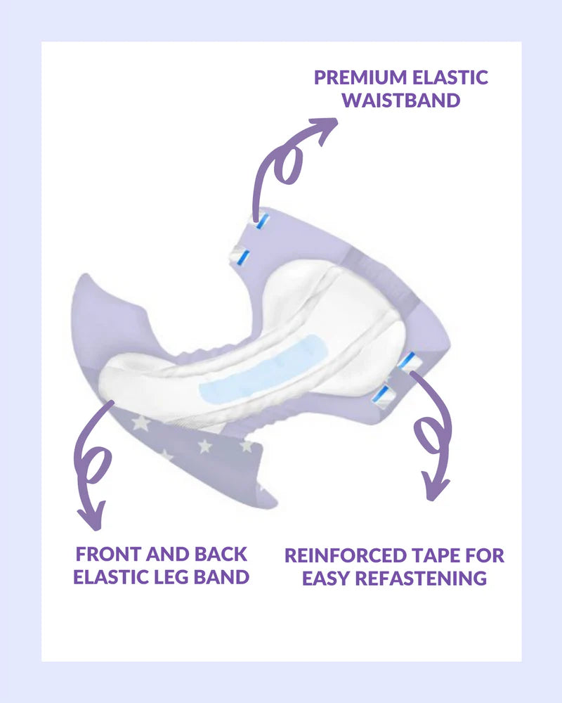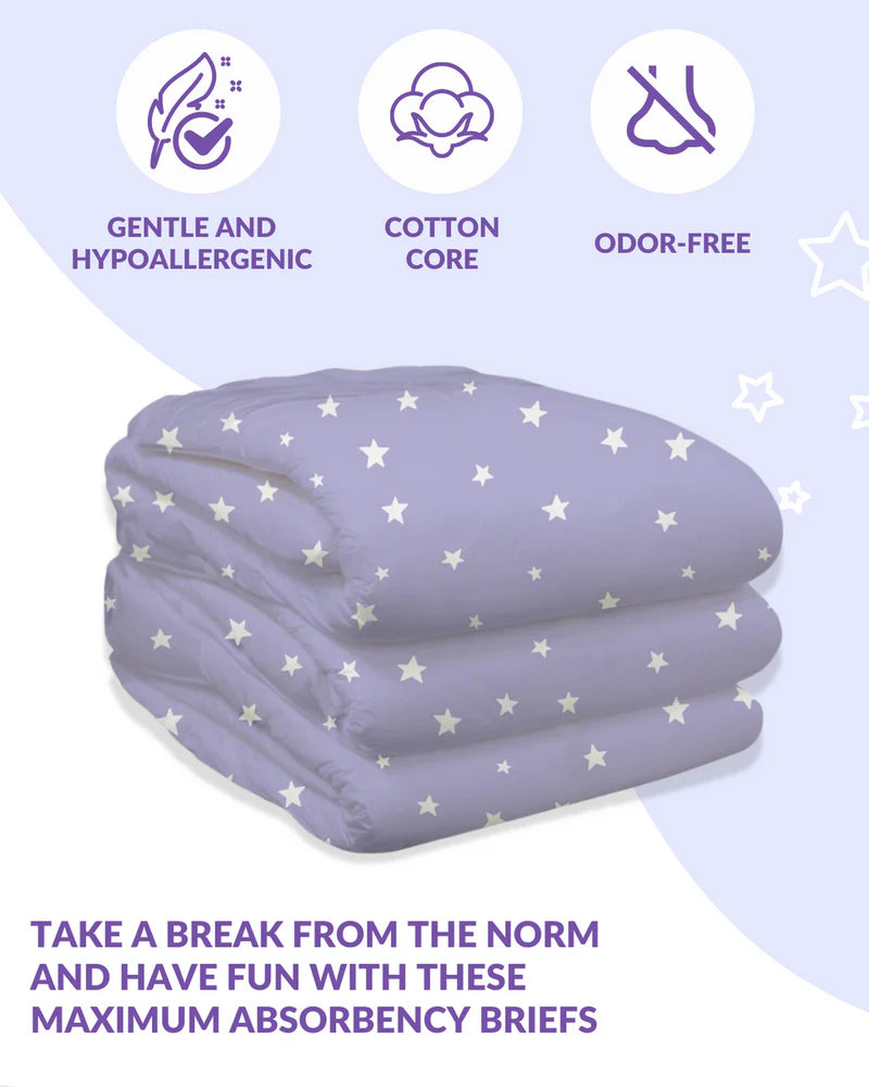 Forsite Health AM:PM Stars Maximum Absorbency Adult Briefs feature an Lavender colour and provide a high-quality choice that won’t let you down. Expect incredible comfort and absorbency in these high-quality adult disposable briefs that boast soft-standing leak guards, odor protection, high-grade USA fluff core, a comfy elastic waistband, and the amazing absorbency of over 5000ml.